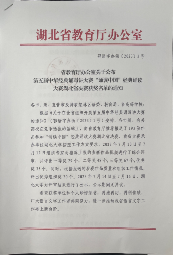 喜报:我院学子在湖北省第五届中华经典诵写讲大赛“诵读中国”经典诵读大赛湖北省决赛获得优秀奖