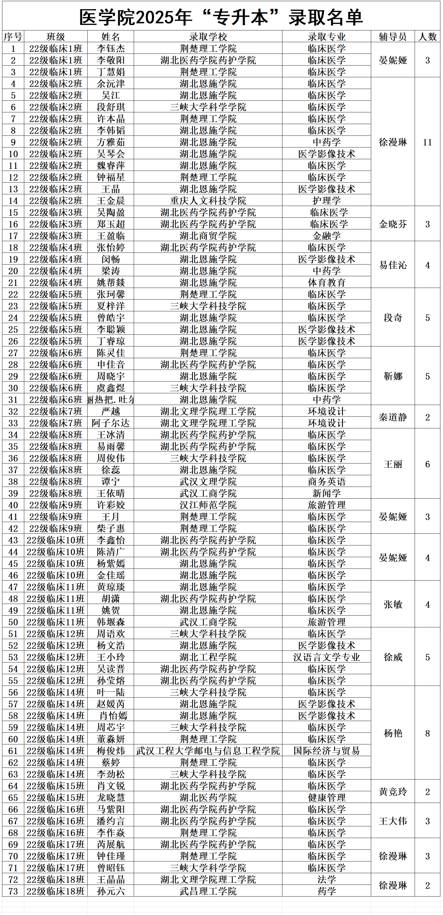 栉风沐雨砥砺行,春华秋实满庭芳。近日,湖北省2025年普通高校专升本录取结果已经公布,我校医学院2025年临床专业毕业生在部分本科学校停招和录取名额缩减的双重压力下再次取得可喜成绩。据最新统计数据显示,医学院2025年毕业生最终升学成功73人,录取人数和比例与去年基本持平。捷报传来,医学院上下无不欢欣鼓舞。医学院自2022年迎来首届临床专业毕业生以来,毕业生专升本通过率始终呈逐年攀升趋势,充分展现了我校医学院学生良好的专业水平和奋发进取的精神面貌,突显了我校不断深化教育和教学改革、强化教学管理、加强学风建设所取得的良好成果。