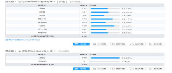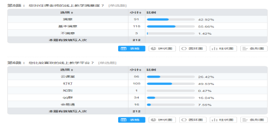总共收回问卷212份,占学生总数81.5%,由于医学院部分学生身处偏远地区,网络环境一般,通过直播学习有些难度,医学院老师创新教学方法与手段,采用传输教学资源、按时布置作业和答疑等方式,保证了整体线上学习效果。学生特别喜欢金洁、任凤、琚小丹等老师,最喜爱的是钉钉直播平台。医学院线上教学工作已逐渐步入正轨,学生也在努力适应线上学习,相信通过医学院全体师生的共同努力,线上教学工作会越来越好。