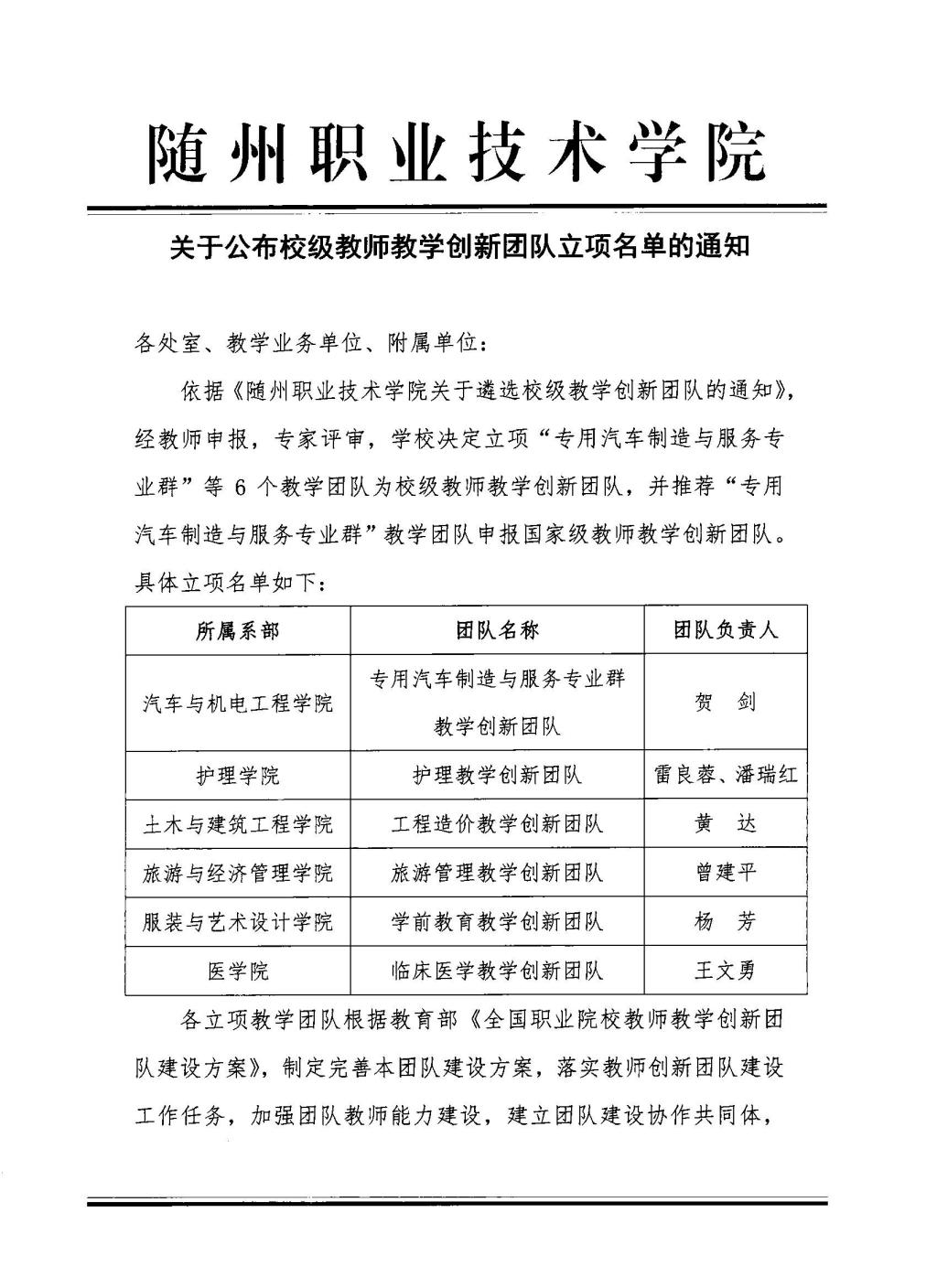 医学院为深入贯彻落实《国家职业教育改革实施方案》、《深化新时代职业教育“双师型”教师队伍建设改革实施方案》,根据《全国职业院校教师教学创新团队建设方案》、《职业 教育提质培优行动计划(2020- -2023年)》文件精神,扎实推进学院“双高”建设,深化“三教”改革,打造一批高质量专业教师教学创新团队,引领学院高质量发展,参加本次校级教学创新团队建设项目申报,并获得校级立项。