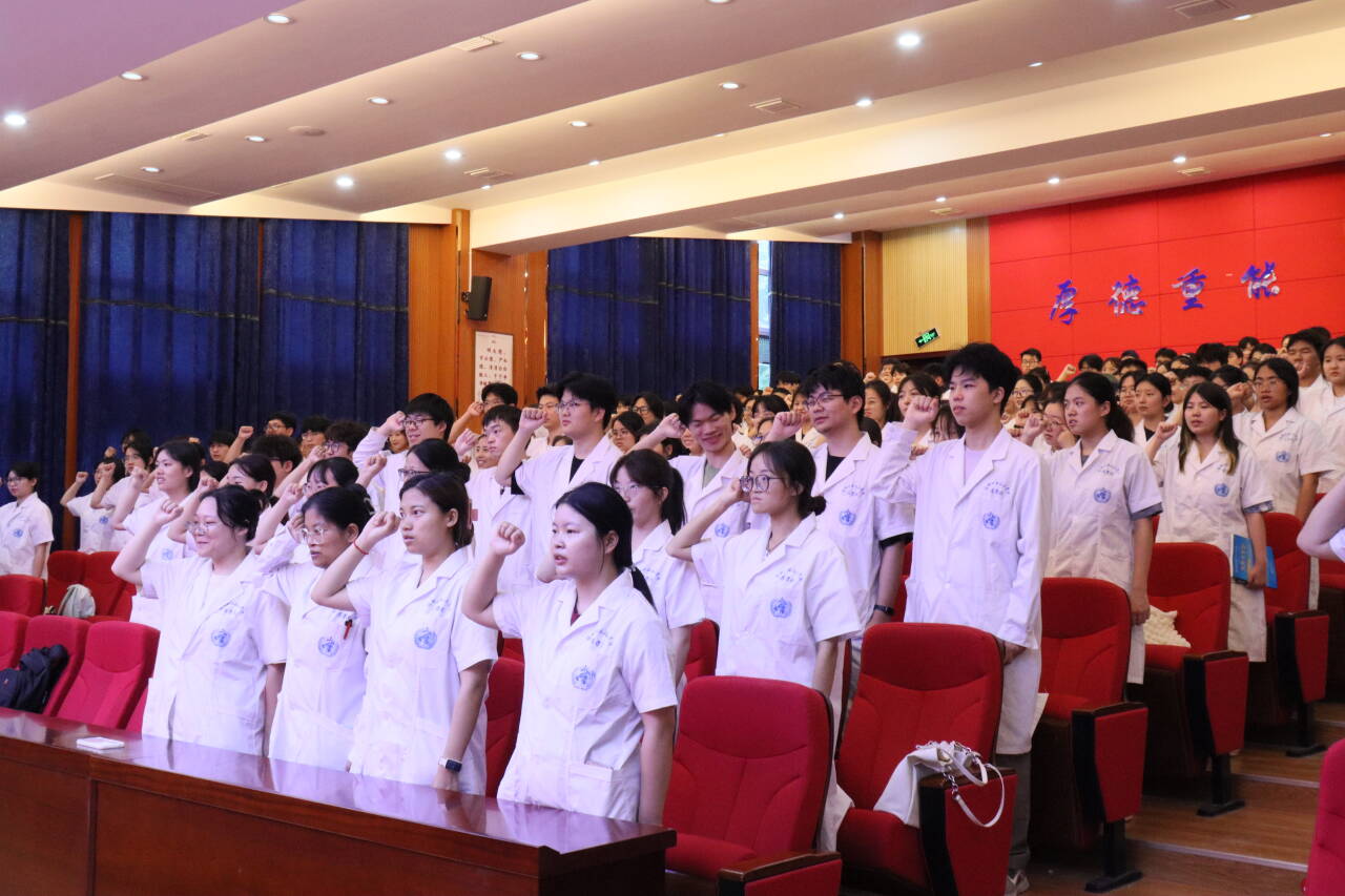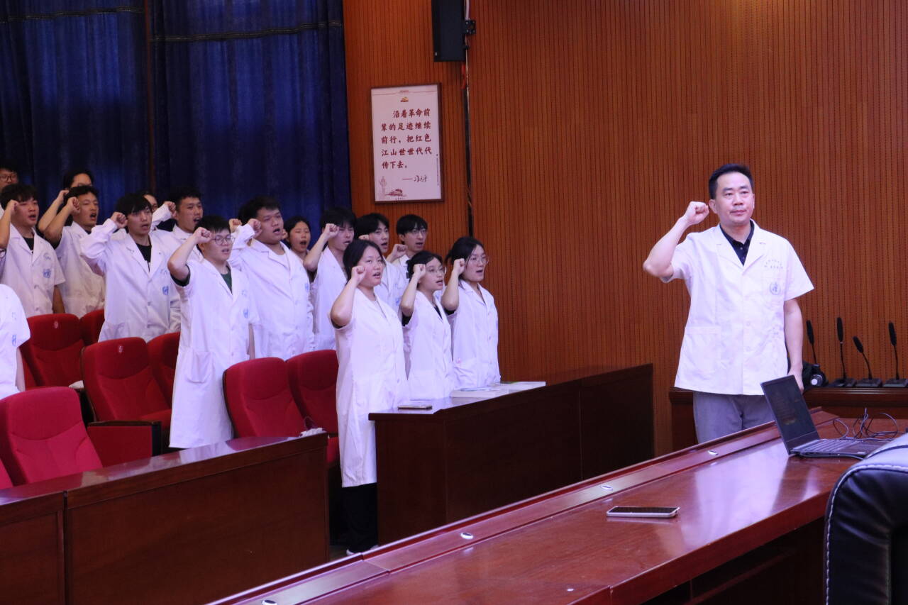 随后,在医学院学工办主任王诚的带领下,全体2023级学生庄严宣读医学生誓词,铿锵有力的誓言,展现了同学们对医学事业的无限向往与为守护人民健康奉献力量的坚定决心,也让现场所有人感受到了医学生们的使命感与责任感。