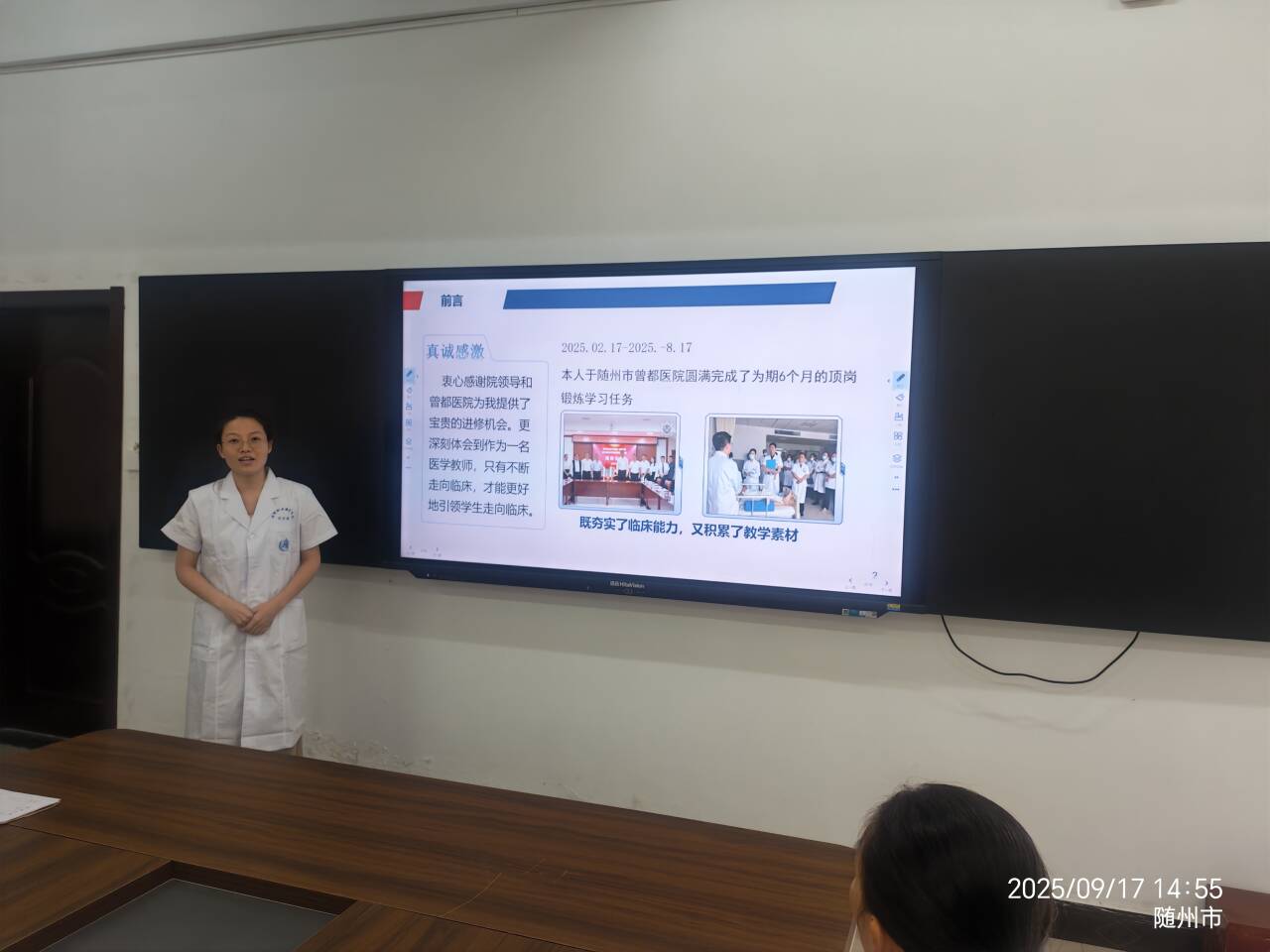 活动伊始,徐林胜子老师就其在我校附属曾都医院的进修学习成果进行了全面汇报。她围绕“技能精进”、“核心操作突破”及“诊疗思维改变”三大维度,结合临床实例,生动详实地分享了在进修期间获得的宝贵经验和深刻体会。她表示,此次进修不仅提升了自身的临床操作规范化水平,更重要的是促进了临床思维与教学实践的深度融合,为今后更好地培养符合临床需求的高素质医学人才奠定了坚实基础。