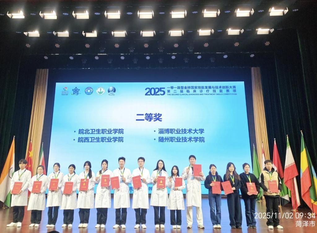 2025年10月30日至11月2日,一带一路暨金砖国家技能发展与技术创新大赛临床诊疗技能赛项在山东省菏泽医学专科学校成功举办。随州职业技术学院医学院临床医学专业学子付豪、张锦剑、王玉婷、欧阳璇组成的参赛团队发挥出色,荣获二等奖,为学校再添荣誉。