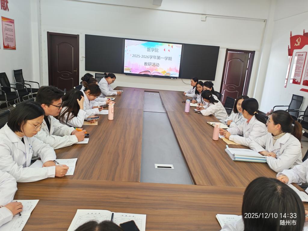 2025年12月10日下午14:30,医学院教研室在学院会议室组织召开本学期第九次教研活动,全体专任教师参加。会议由教研室琚主任主持,聚焦2026年“中银杯”湖北省职业院校技能大赛医学技术赛道承办筹备工作及近期教学安排进行研讨与部署。