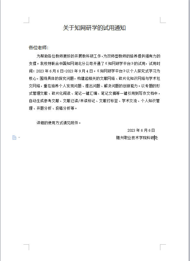 为帮助各位教师更好的开展教科研工作,为双师型教师的培养提供强有力的支撑。我校特联合中国知网湖北分公司开通了《知网研学平台》的试用,试用时间:2023年6月6日-2023年9月4日。