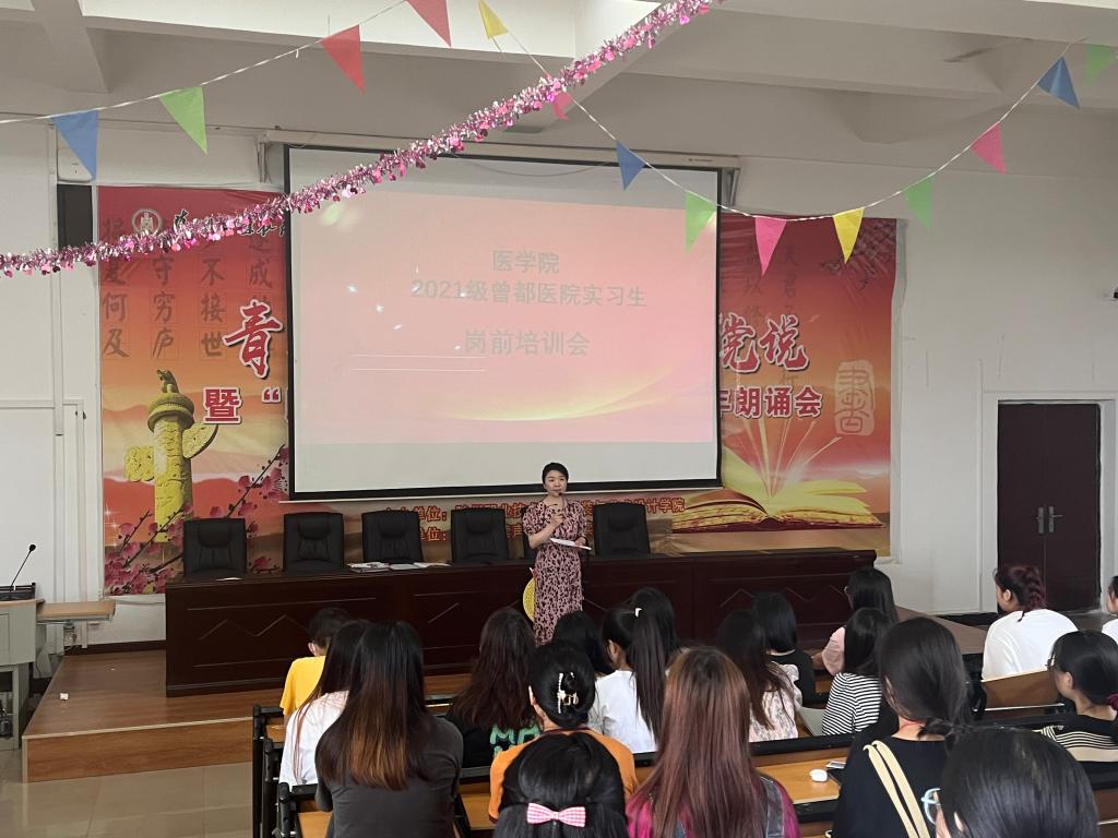 医学院教学副院长冯丽对2021级随州市曾都医院进行岗前培训,要求同学们明确实习要求,遵守实习守则,摆正心态,跟随带教教师学习临床技能,认真完成实习鉴定,有效复习助理医师考试及专升本考试,并预祝全体同学在实习中都学有所获。