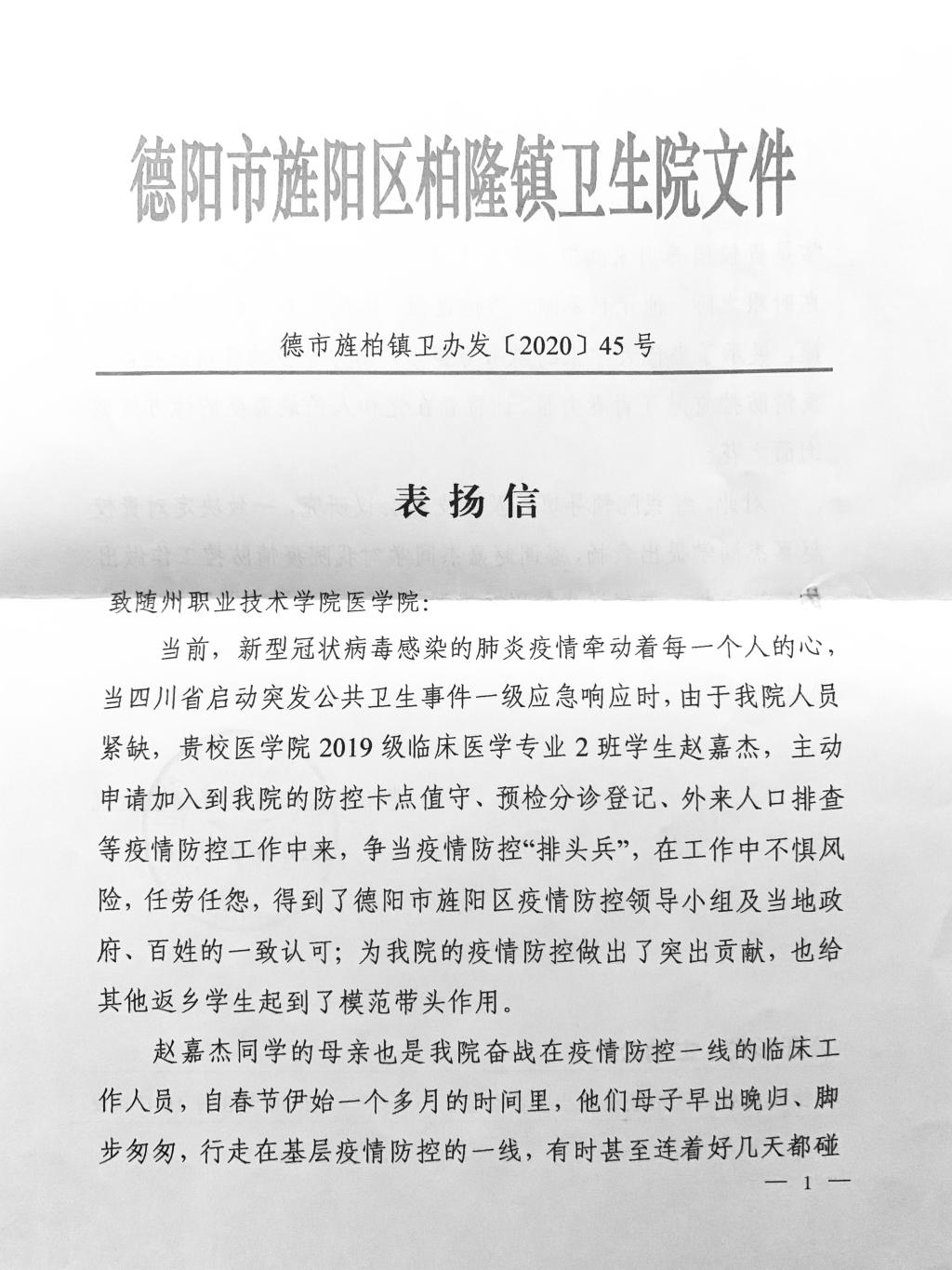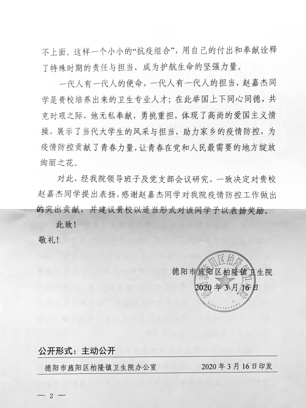 德阳一所卫生院致我院赵嘉杰同学疫情防控期间表现优秀的一封感谢信