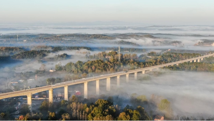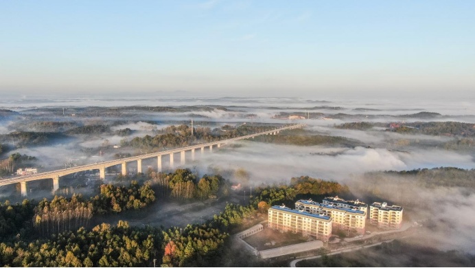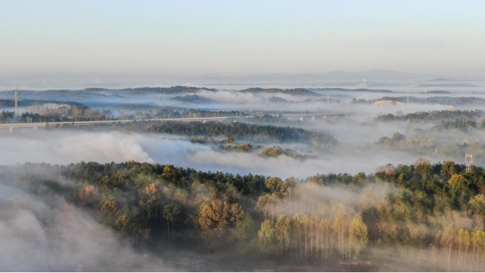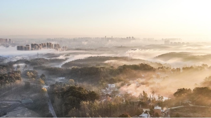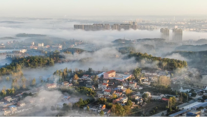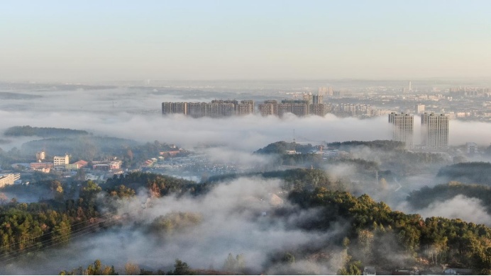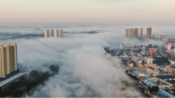 冬日,湖北省随州市城南郊区上空云雾缭绕,从空中俯瞰,房屋与远山在雾中若隐若现,宛若仙境。