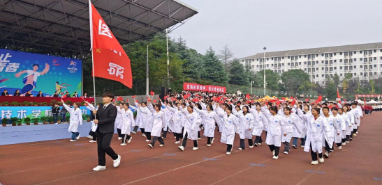 随后,各院系运动员方阵依次经过主席台。其中,医学院方阵高举院旗、高呼“医者仁心,大爱无疆,随大医学,创造辉煌”的口号,散发着勃勃朝气,展现出了医学院这个年轻的学院特有的活力。