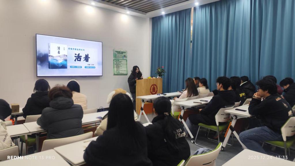 活动在刘雨轩老师的主持下拉开序幕。分享环节首先由三位同学带来深度导读:她们分别从《活着》中感悟生命的韧性与厚重,在《平凡的世界》里体察奋斗的尊严与光辉,于《文城》中追寻命运的漂泊与归宿。分享者结合自身生命体验,将书中汲取的知识与力量娓娓道来,引发了在场听众的深切共鸣。