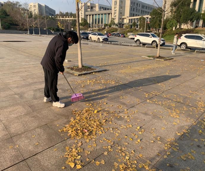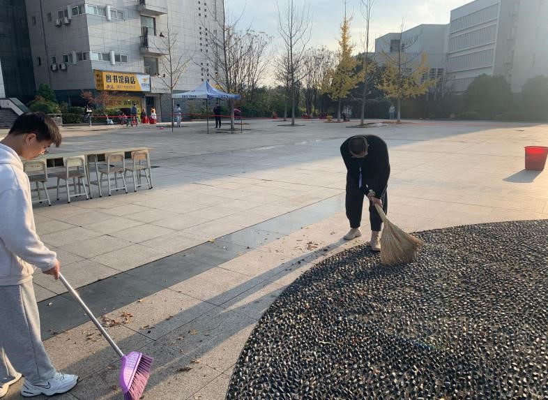 2020年11月19日,医学院学生会志愿者自发在图书馆门口广场打扫场内卫生,保障场内卫生整洁。