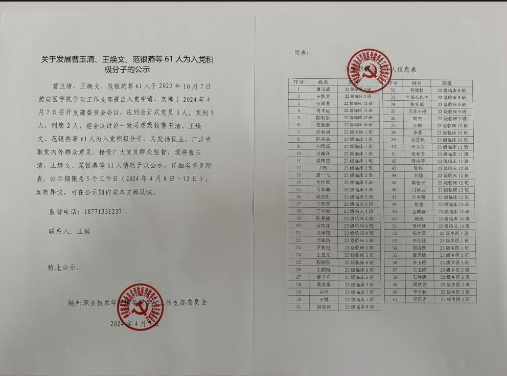 关于发展曹玉清、王焕文、范银等61人为入党积极分子的公示