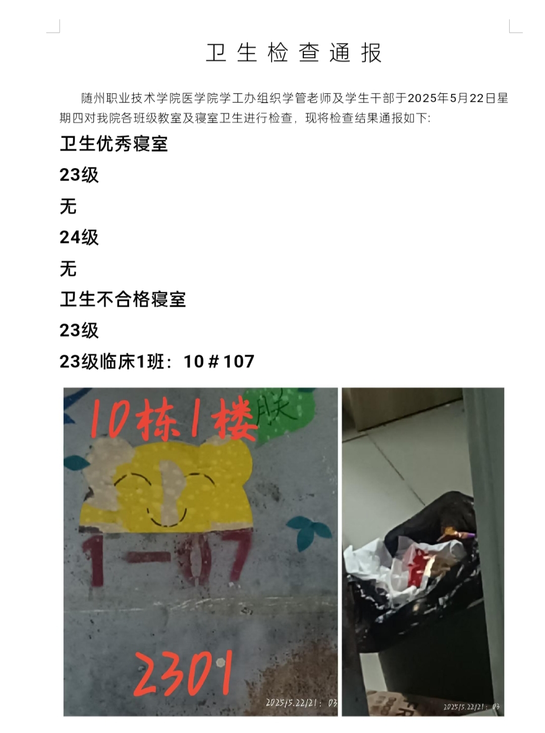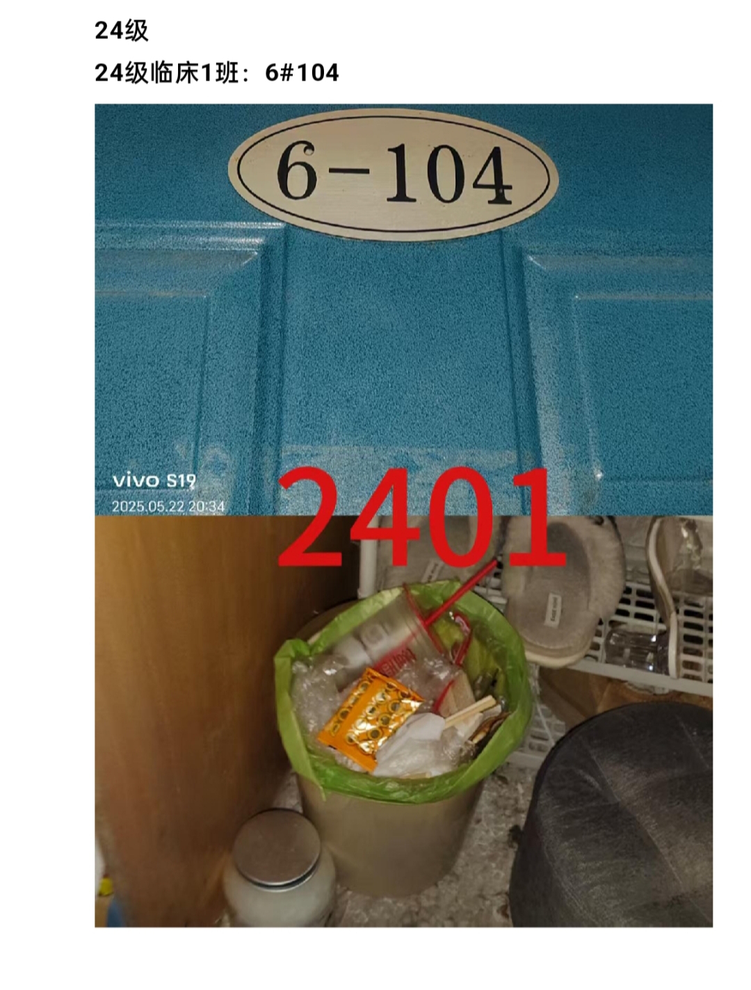 2025年5月22日 20:30 五六栋之间 学生会检查寝室卫生 通报表如下: