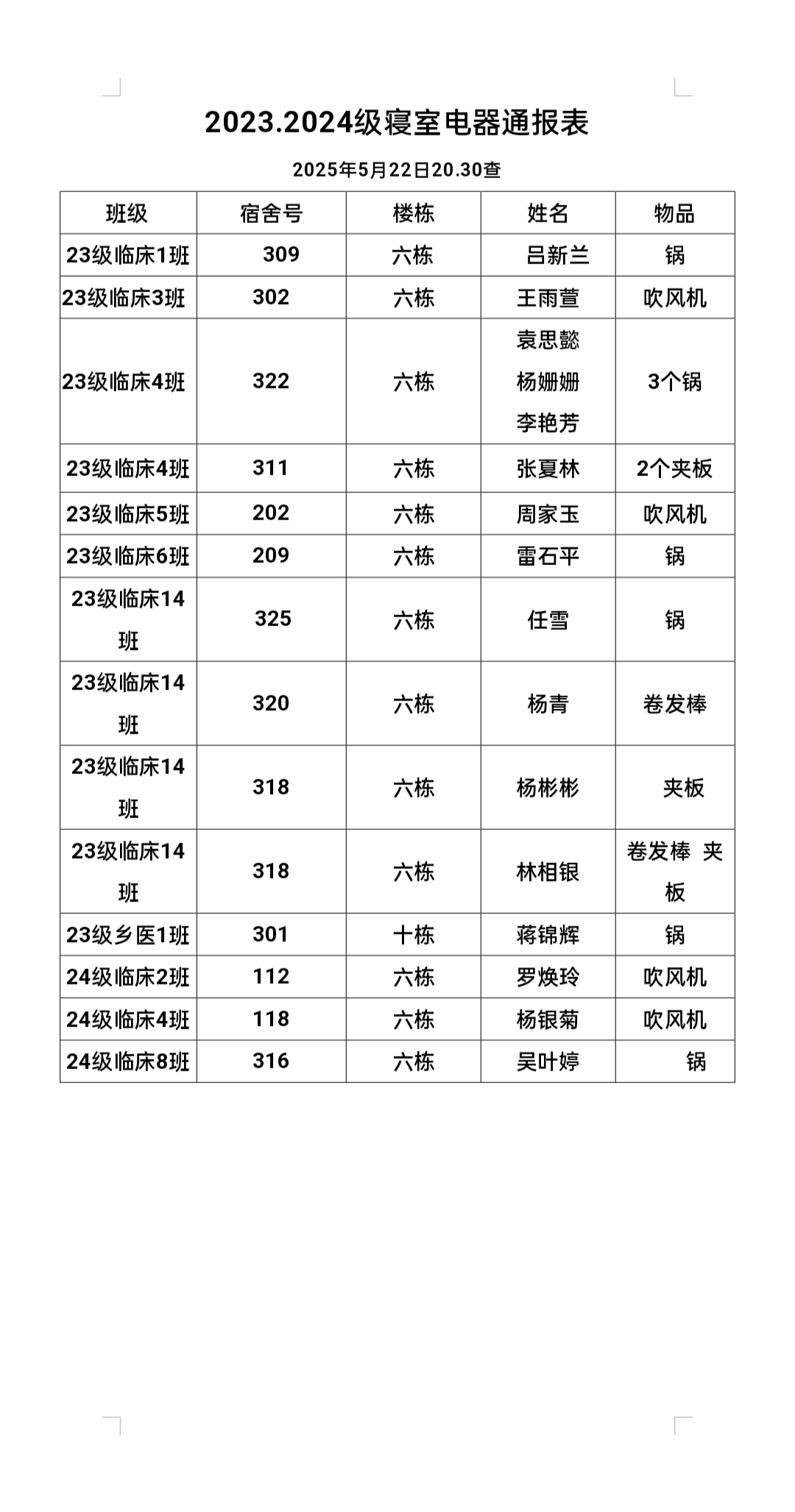 2025年5月22日 20:30 五六栋之间 学生会排查大功率电器 通报表如下: