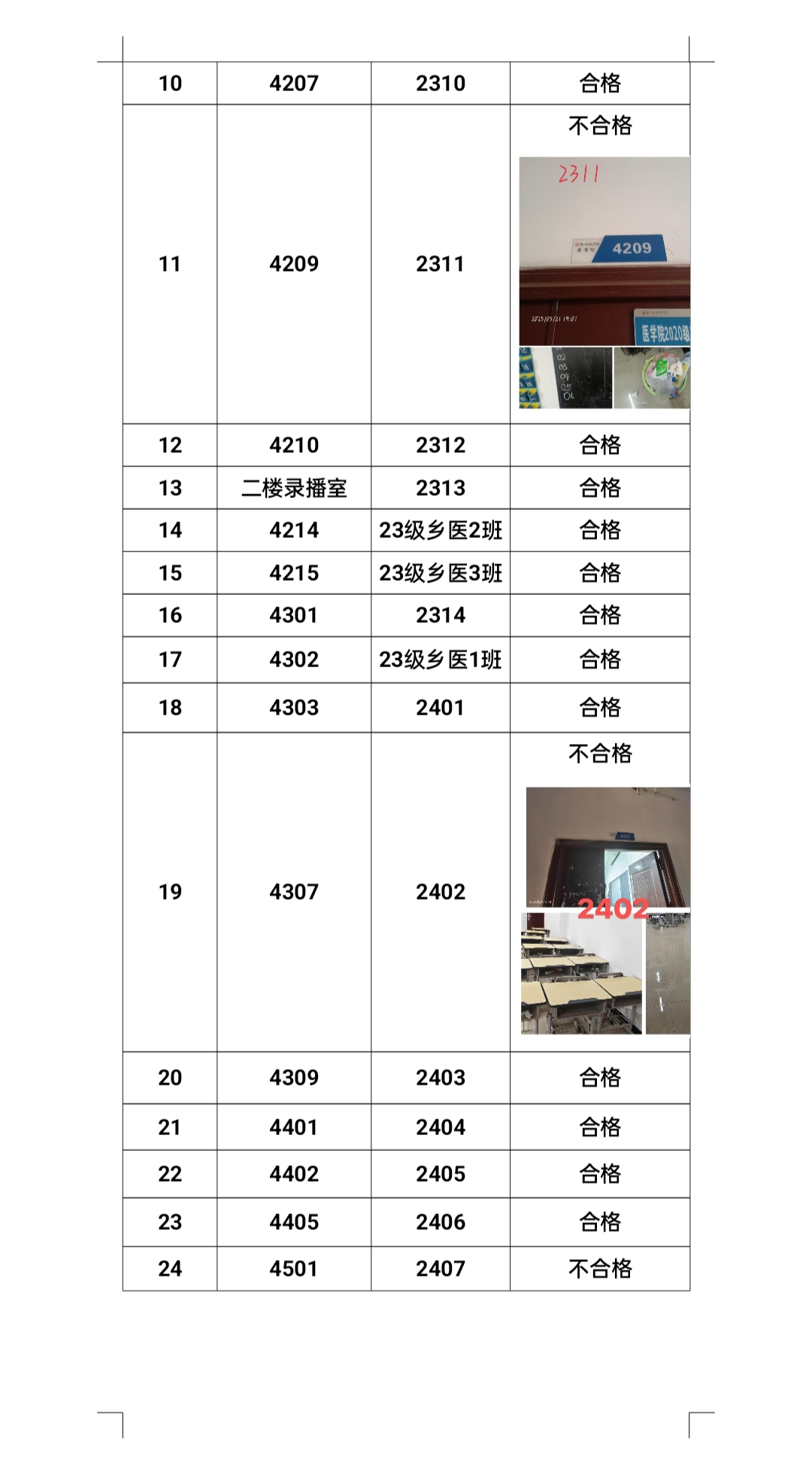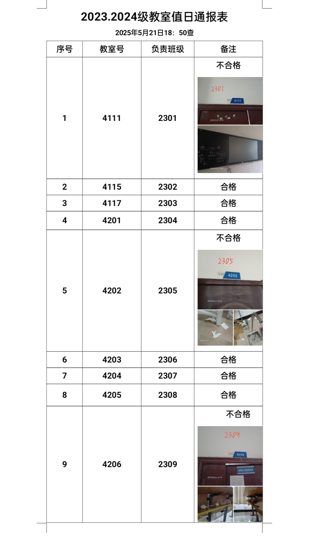 2025年5月21日 18:50 云桂楼一楼大厅 学生会检查教室卫生 通报表如下: