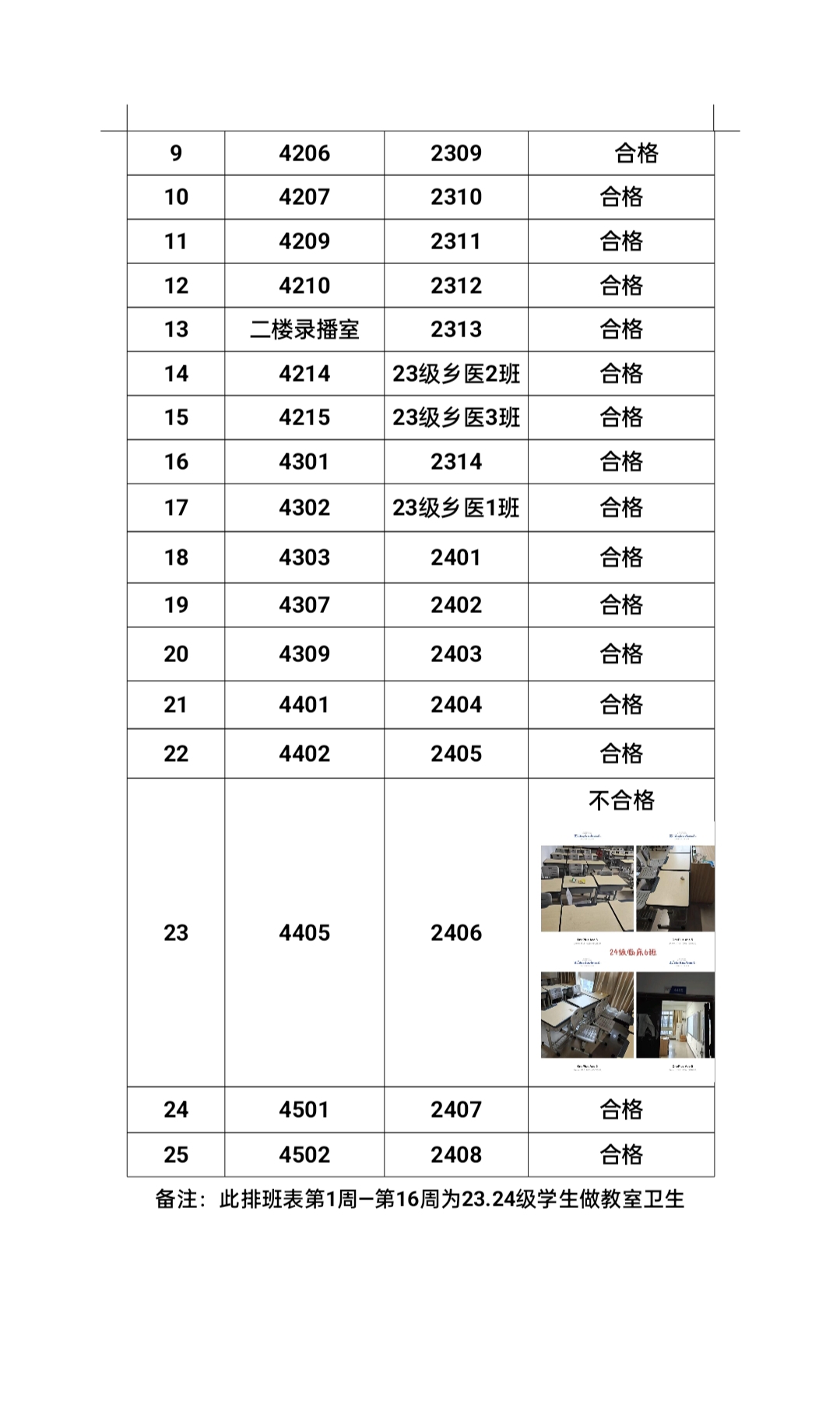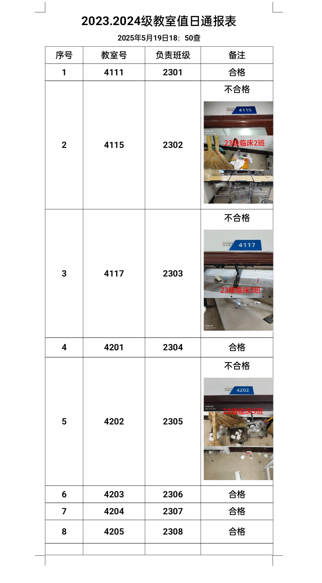 2025年5月19日 18:50 云桂楼一楼大厅 学生会检查教室卫生 通报表如下: