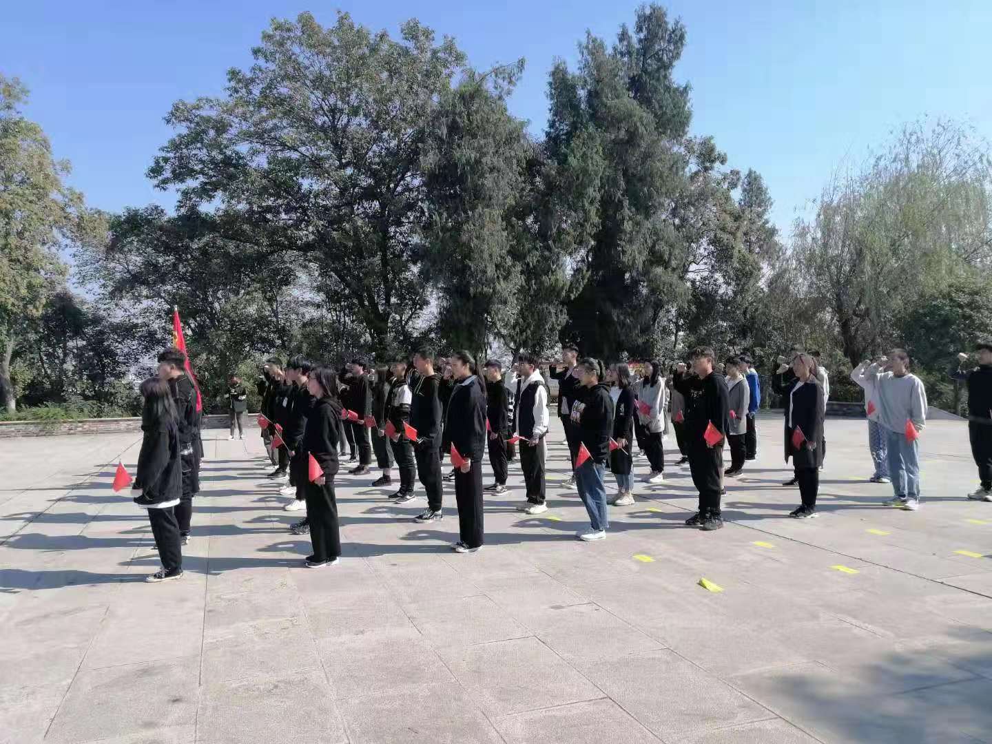10点15分左右,志愿者到达了烈士陵园,这庄严肃穆的气氛使我们显得格外安静,生怕一个不小心打扰到了安息的烈士。在工作人员指挥下,所有成员在纪念碑前整队站好等待活动的开始。10点45分活动开始,首先齐唱国歌,共同追忆革命事迹,随后,向烈士敬献花圈。与其同时,各位成员也将各自手中的国旗立起来,低头向革命烈士默哀一分钟。