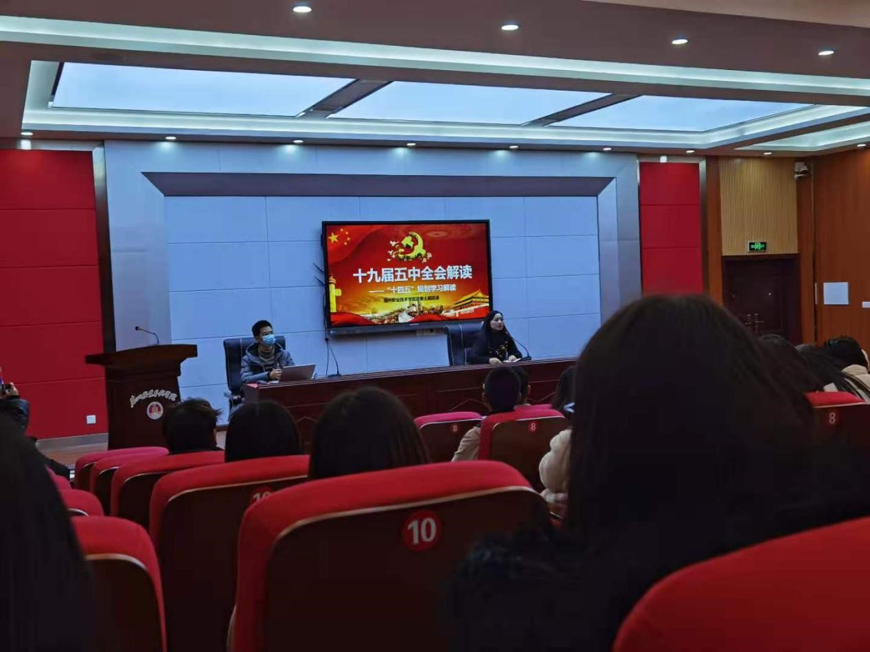 2020年11月23日晚上,学校开展以“学习贯彻党的十九届五中全会精神”为主题的“十四五”规划解读的团日活动,本次活动由随州职业技术学院团委组织各院系团支书和校学生会在云桂楼一楼学术报告厅举行,有院团委程蓉书记、团委陈赛老师和团委周钰老师出席本次活动。