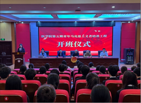医学院第五期青年马克思主义者培养工程于2025年4月11日中午12:50在学术报告厅顺利召开。医学院党总支书记、院长王文勇、医学院党总支副书记周正、医学院学工办主任王诚、医学院学工办副主任卢伦、医学院团总支书记朱春丽等各位领导出席本次开班仪式。