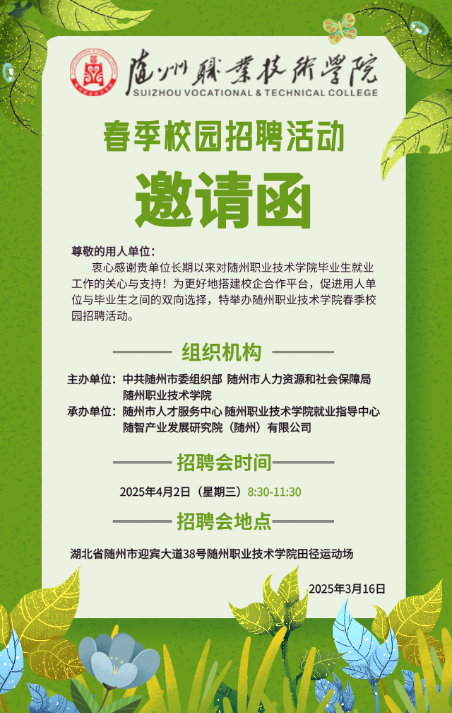 随州职业技术学院春季校园招聘会于2025年4月2日(星期三) 8:30-11:30